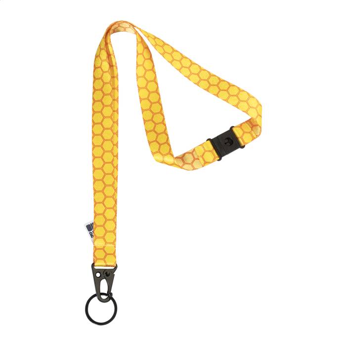 Egyedi gyártású, RPET anyagból készült nyakpánt fekete fém taktikai stílusú karabinerrel, kulcstartóval és biztonsági csattal. Mindkét oldalon szublimációs nyomtatott grafikával. Minimális rendelési mennyiség: 100 db.