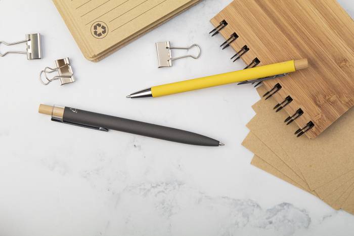 Újrahasznosított alumínium golyóstoll gumírozott felülettel, bambusz gombbal és króm klipsszel. Speciális bevonattal rendelkezik, amely különlegesen fényessé teszi a gravírozott emblémát. Kék tollbetéttel szállítjuk.