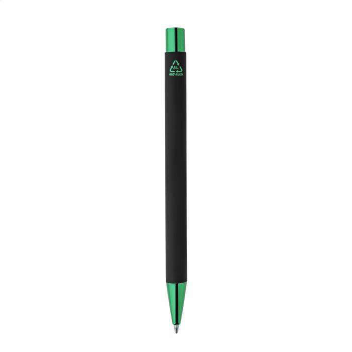 Újrahasznosított alumínium golyóstoll fekete gumírozott testtel és színes, metálfényű részekkel. Speciális bevonattal a fémes részekhez illeszkedő tükörgravírozáshoz. Kék tollbetéttel.