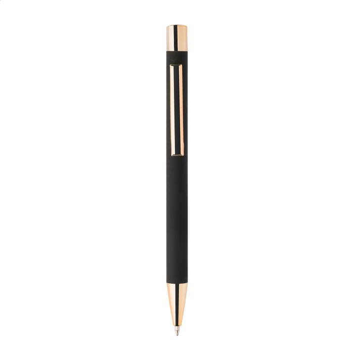Újrahasznosított alumínium golyóstoll fekete gumírozott testtel és színes, metálfényű részekkel. Speciális bevonattal a fémes részekhez illeszkedő tükörgravírozáshoz. Kék tollbetéttel.