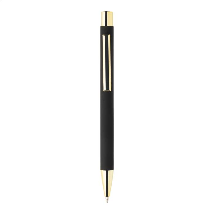 Újrahasznosított alumínium golyóstoll fekete gumírozott testtel és színes, metálfényű részekkel. Speciális bevonattal a fémes részekhez illeszkedő tükörgravírozáshoz. Kék tollbetéttel.