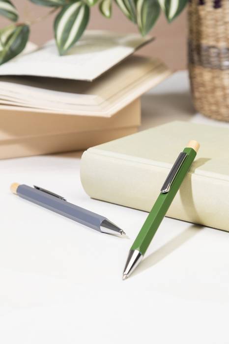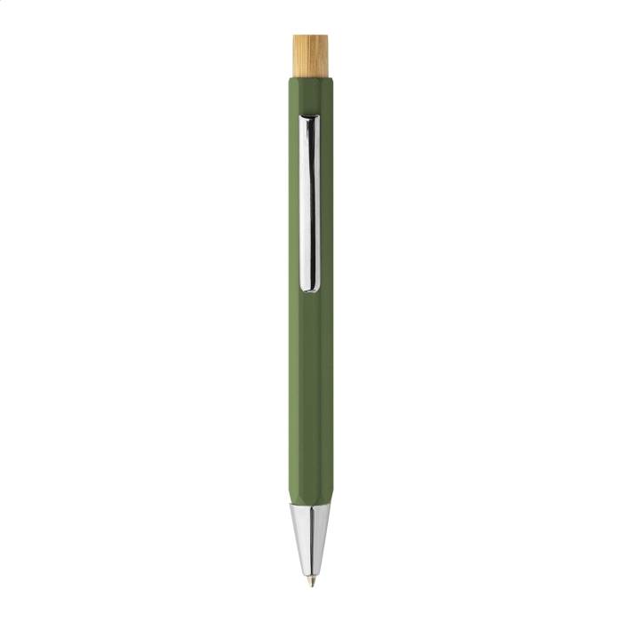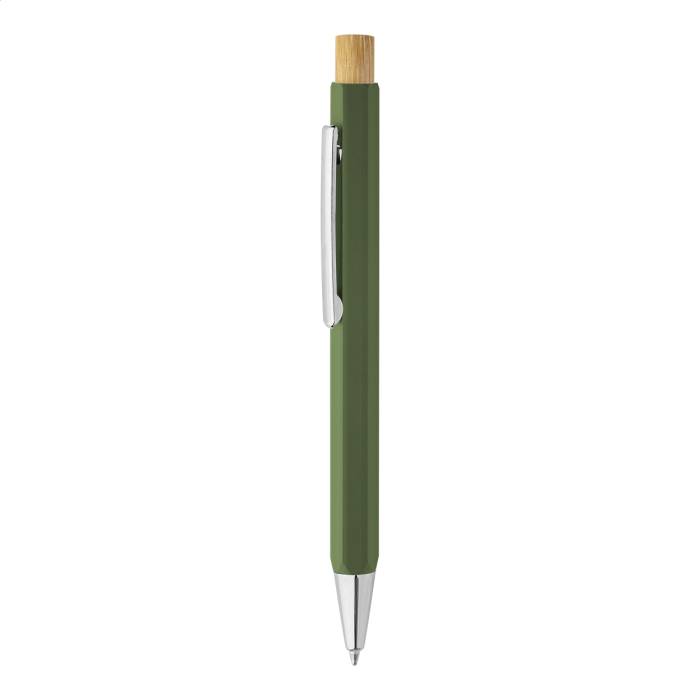 Hatszögletű, újrahasznosított alumínium golyóstoll bambusz gombbal és króm részekkel. Kék tollbetéttel.