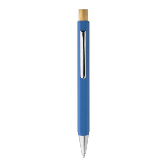 Hatszögletű, újrahasznosított alumínium golyóstoll bambusz gombbal és króm részekkel. Kék tollbetéttel.