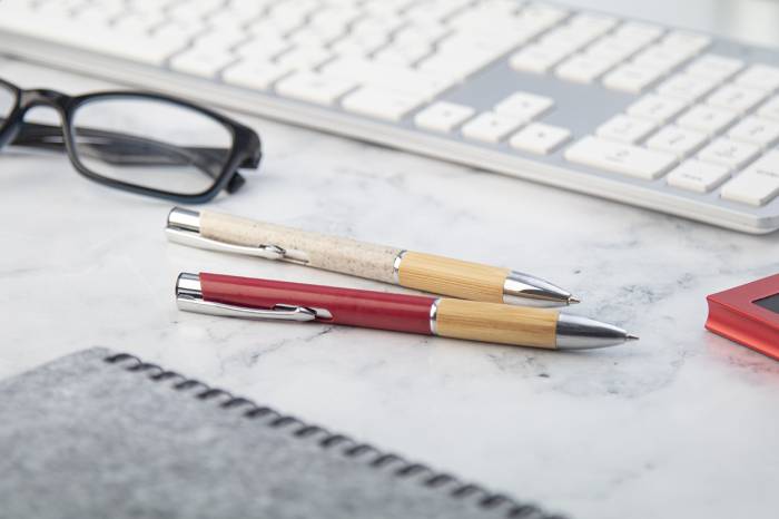 Környezetbarát búzaszalma műanyag golyóstoll bambusz markolattal és fém részekkel. Kék tollbetéttel szállítjuk.