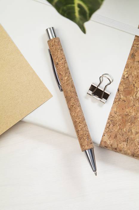 Természetes parafa borítású, újrahasznosított papír golyóstoll fém részekkel. Kék tollbetéttel szállítjuk.