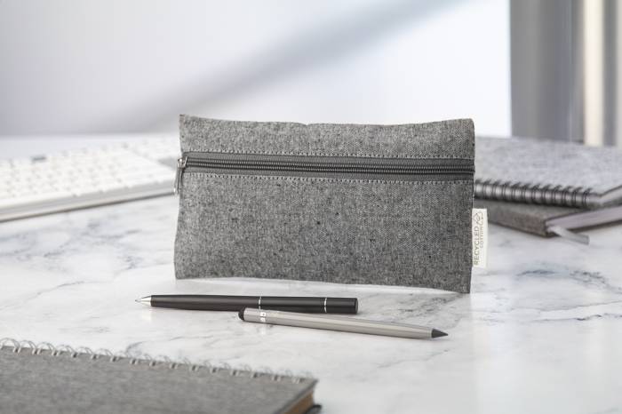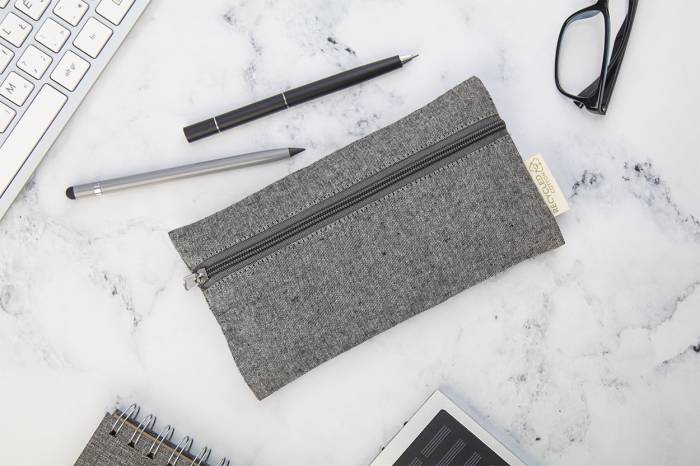 Cipzáras, újrahasznosított pamut tolltartó megkülönböztető címkével. 100% újrahasznosított pamut.