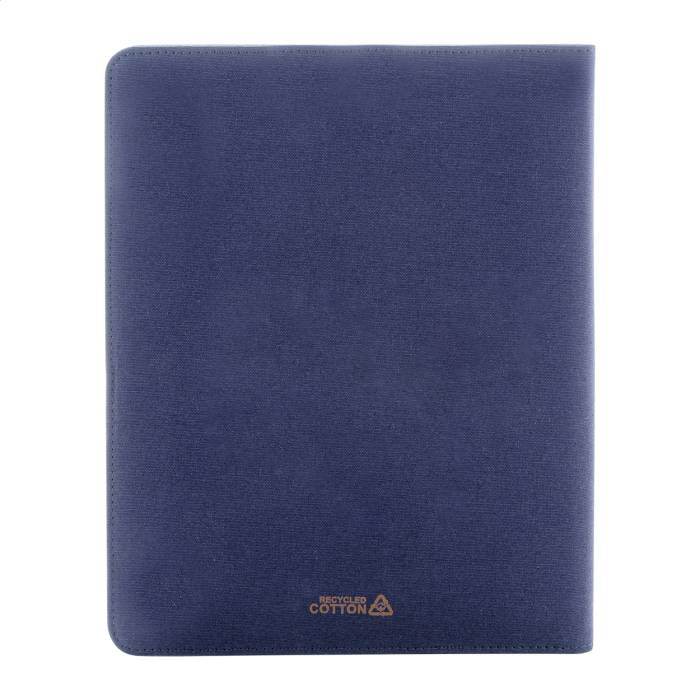 A4 méretű, újrahasznosított vászonból és újrahasznosított PU bőrből készült iratmappa több elülső és belső rendező zsebbel. 20 újrahasznosított papír anyagú, vonalas lapos jegyzetfüzettel. 70% újrahasznosított pamut és 30% RPET poliészter.