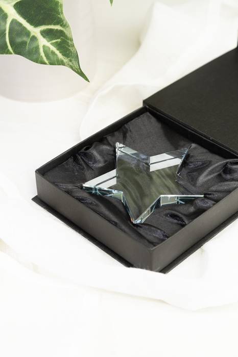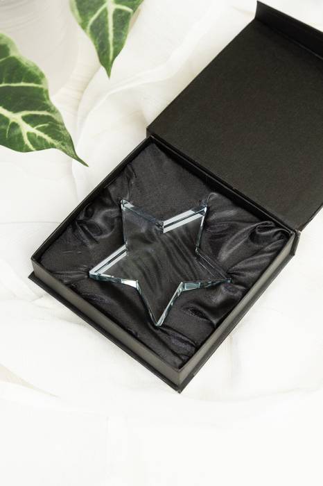 Csillag alakú üveg trófea, fekete díszdobozban.