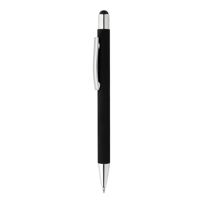 Újrahasznosított alumínium érintőképernyős golyóstoll fekete gumírozott testtel és színes, metálfényű részekkel. Speciális bevonattal a fémes részekhez illeszkedő tükörgravírozáshoz. Kék tollbetéttel.