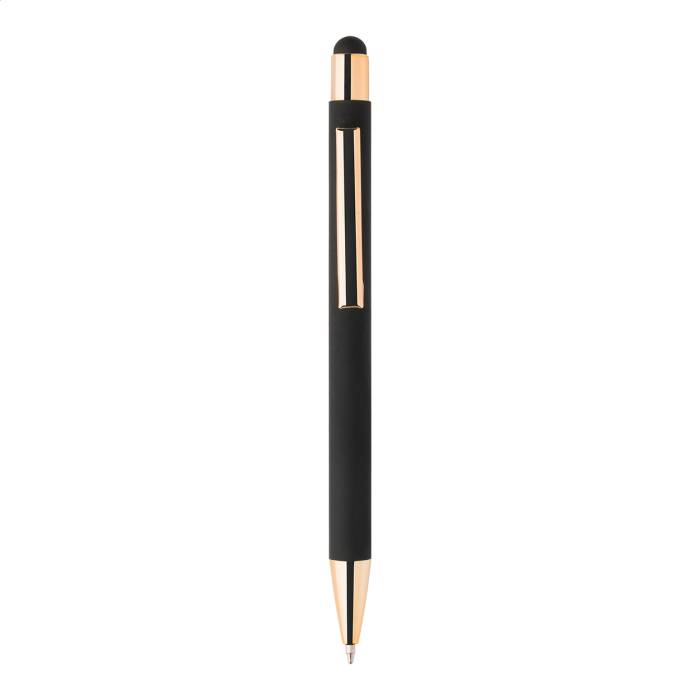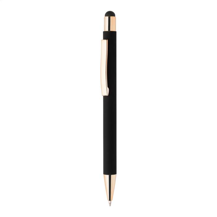 Újrahasznosított alumínium érintőképernyős golyóstoll fekete gumírozott testtel és színes, metálfényű részekkel. Speciális bevonattal a fémes részekhez illeszkedő tükörgravírozáshoz. Kék tollbetéttel.