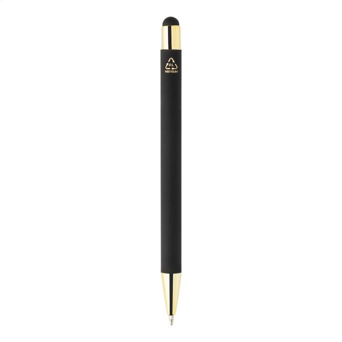 Újrahasznosított alumínium érintőképernyős golyóstoll fekete gumírozott testtel és színes, metálfényű részekkel. Speciális bevonattal a fémes részekhez illeszkedő tükörgravírozáshoz. Kék tollbetéttel.