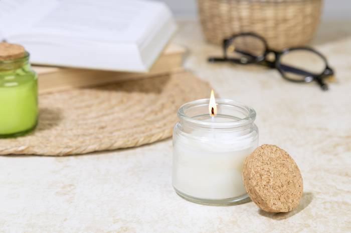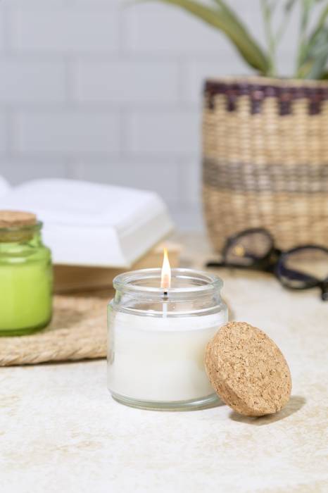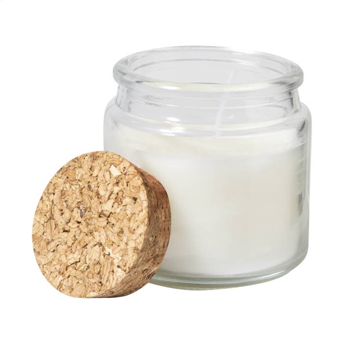 Vanília illatú, növényi alapú viaszgyertya üvegtartóban, natúr parafa fedéllel. 80 gramm viasszal. Égési idő: 16 óra. Krafpapír dobozban.