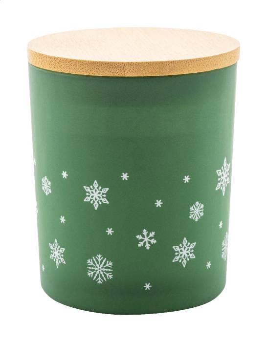 Növényi alapú illatosított viaszgyertya homokfúvott üveg tartóban, karácsonyi hópehely díszítéssel és bambusz fedéllel. 120 gramm viasszal. Kraft papír dobozban.