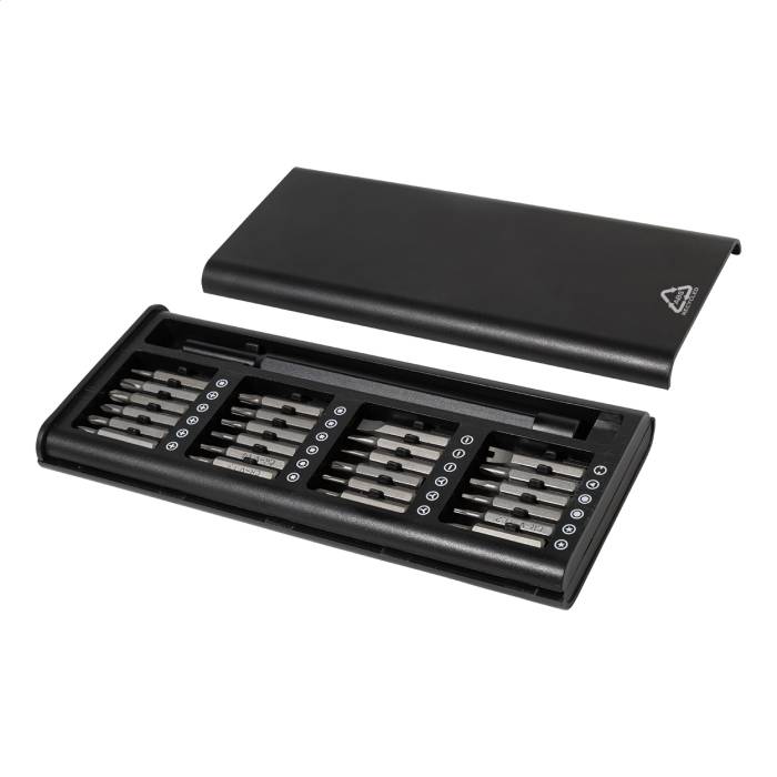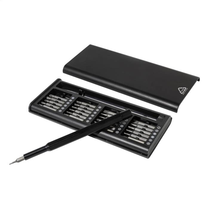 Precíziós csavarhúzókészlet 24 bittel, újrahasznosított ABS tokban. A csavarhúzó nyele mágneses bitrögzítéssel rendelkezik a gyors és biztonságos bitcseréhez.