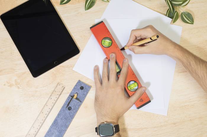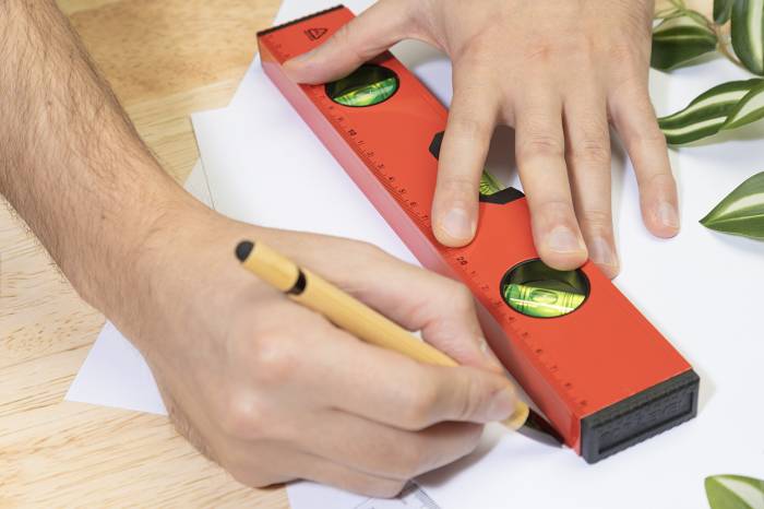 Mágneses vízmérték újrahasznosított alumíniumból, három vízmértékkel (vízszintes, függőleges és 45°-os) és 30 cm-es vonalzóval.