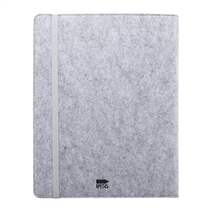 A4-es méretű, RPET filc iratmappa elülső és több belső rendezőzsebbel. 20 vonalas jegyzettömbbel újrahasznosított papírból.