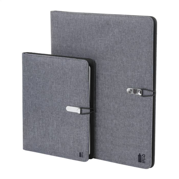 A4 méretű, 300D RPET poliészter iratmappa 25 vonalas lappal és belső rekeszekkel.