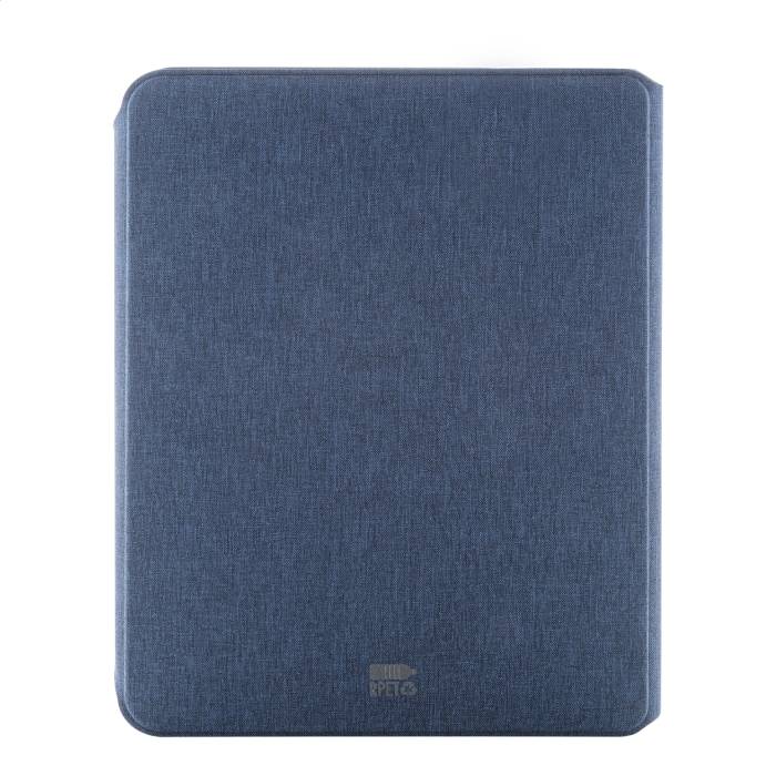 A4 méretű, RPET poliészter iratmappa több belső rendszerező zsebbel és mágneses zárral, diófa díszítéssel. 20 újrahasznosított papír anyagú, vonalas lapos jegyzetfüzettel.