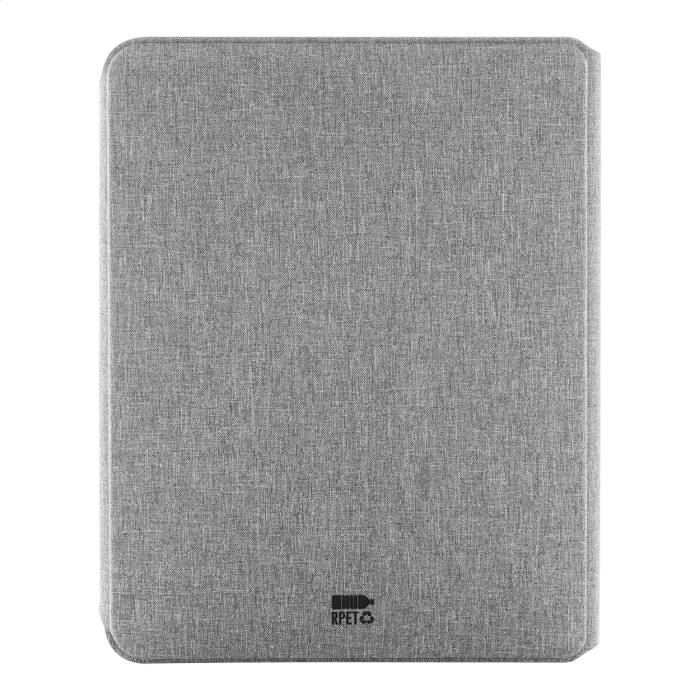 A4 méretű, RPET poliészter iratmappa több belső rendszerező zsebbel és mágneses zárral, diófa díszítéssel. 20 újrahasznosított papír anyagú, vonalas lapos jegyzetfüzettel.