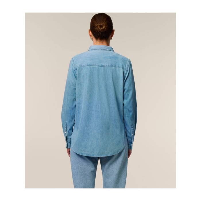 Női farmering, legombolható gallérral, 235 g/m², időtálló, organikus pamut anyagból, többféle stílusban használható. Közepes szabásával és halványított varrásaival fenntartható alapdarab bármely ruhatárban.