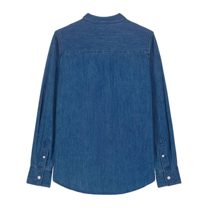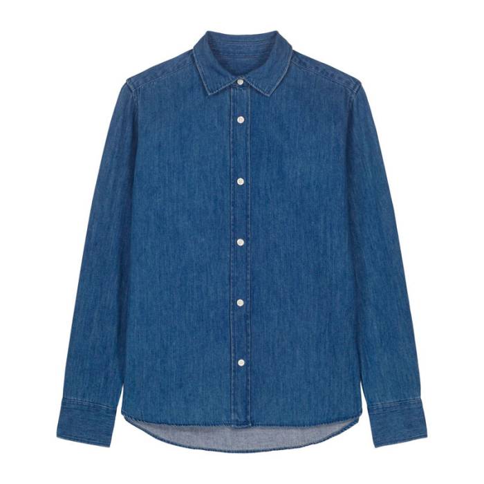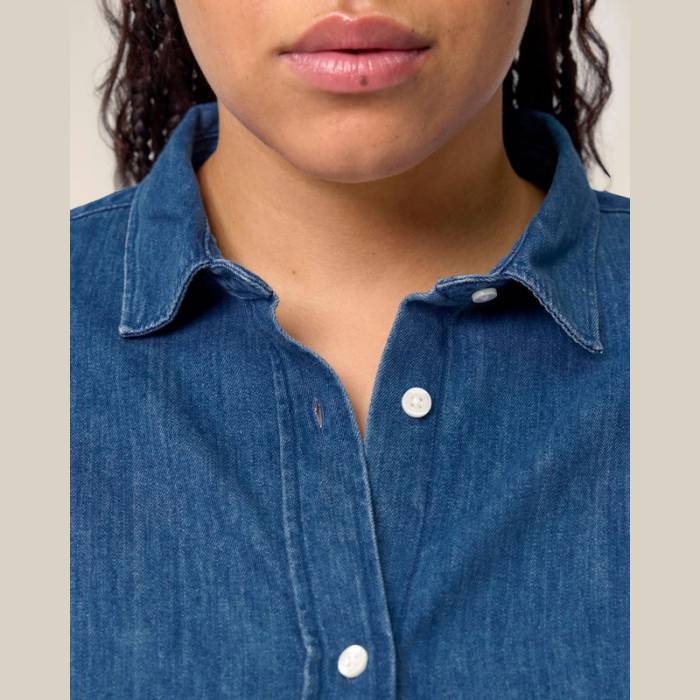 Női farmering, legombolható gallérral, 235 g/m², időtálló, organikus pamut anyagból, többféle stílusban használható. Közepes szabásával és halványított varrásaival fenntartható alapdarab bármely ruhatárban.