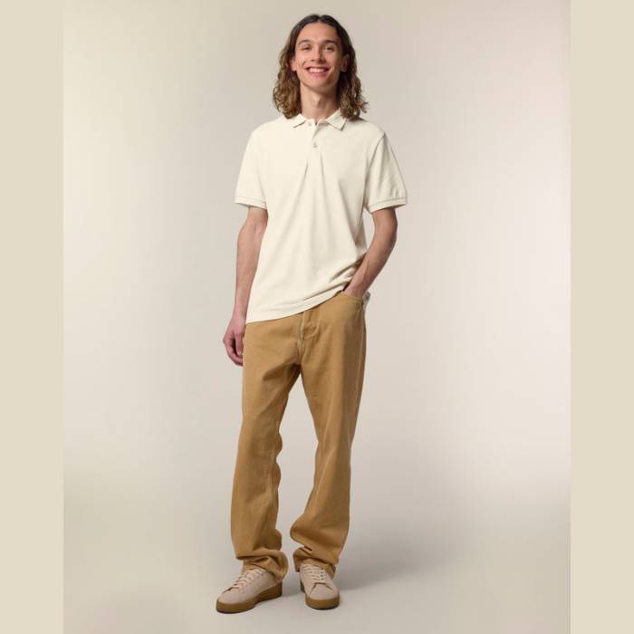 Prémium minőségű, 185 g/m² súlyú férfi póló, amely tökéletes választás melegebb időben. 100% organikus pamutból készült, újrahasznosított gombokkal. Stílusos és fenntartható, ideális egyedi eblémázáshoz. Különböző színekben elérhető.