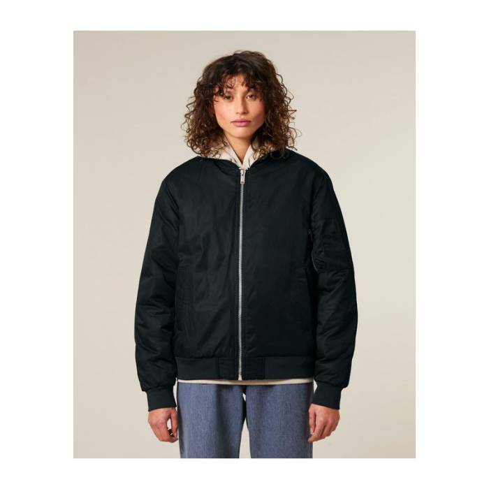 Ez a klasszikus uniszex bomber dzseki ötvözi a vintage stílust a modern eleganciával. 100%-ban újrahasznosított poliészterből készült.