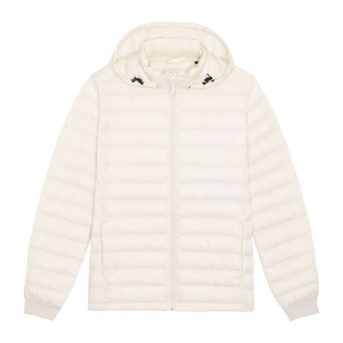 Bevarrt ujj. Magas gallér lecsatolható kapucnival, matt fém rejtett patentokkal. A kapucsi nyílása és az alsó szegély állítható műanyag záróval és rugalmas zsinórral. Fordított nejlon cipzár elöl, középen. Cipzáras zsebek díszszalaggal ellátott húzóval. Teljesen steppelt kivitel. Oldalpanelek a jobb illeszkedésért. Puha 1x1 bordás mandzsetta az ujjak végén. A belső varratok szegéllyel eldolgozva.