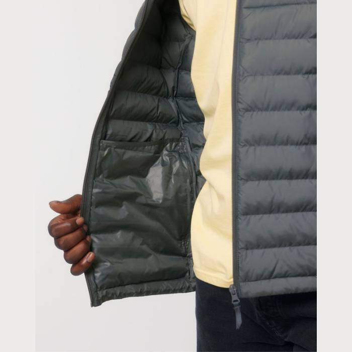 Bevarrt ujj. Magas gallér lecsatolható kapucnival, matt fém rejtett patentokkal. A kapucsi nyílása és az alsó szegély állítható műanyag záróval és rugalmas zsinórral. Fordított nejlon cipzár elöl, középen. Cipzáras zsebek díszszalaggal ellátott húzóval. Teljesen steppelt kivitel. Oldalpanelek a jobb illeszkedésért. Puha 1x1 bordás mandzsetta az ujjak végén. A belső varratok szegéllyel eldolgozva.