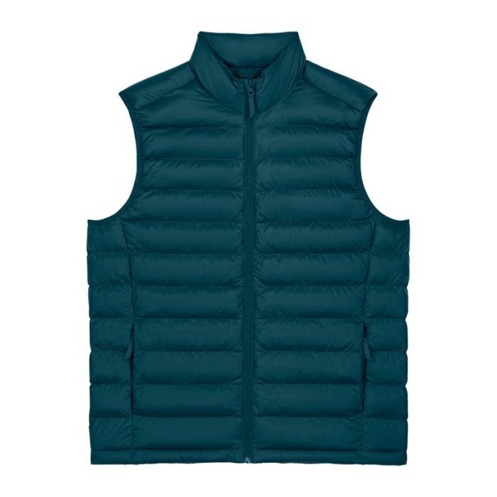 Ujjatlan kialakítás. Magas gallér. Fordított nejlon cipzár elöl, középen. Cipzáras zsebek díszszalaggal ellátott húzóval. Rugalmas szegőszalag a karkivágásnál. Teljesen steppelt kivitel. Oldalpanelek a jobb illeszkedésért. A belső varratok szegéllyel eldolgozva. Az alsó szegély állítható műanyag záróval és rugalmas zsinórral.