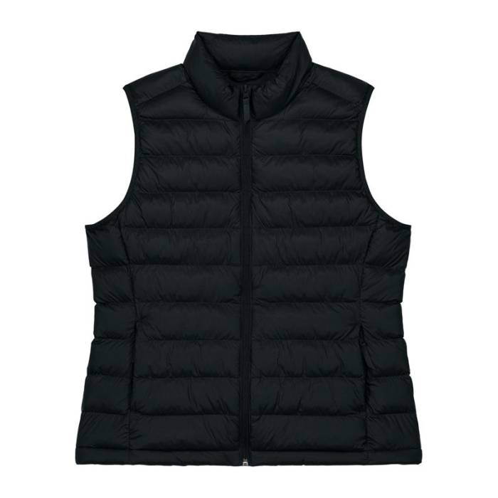 Ujjatlan kialakítás. Magas gallér. Fordított nejlon cipzár elöl, középen. Cipzáras zsebek díszszalaggal ellátott húzóval. Rugalmas szegőszalag a karkivágásnál. Teljesen steppelt kivitel. Oldalpanelek a jobb illeszkedésért. A belső varratok szegéllyel eldolgozva. Az alsó szegély állítható műanyag záróval és rugalmas zsinórral.