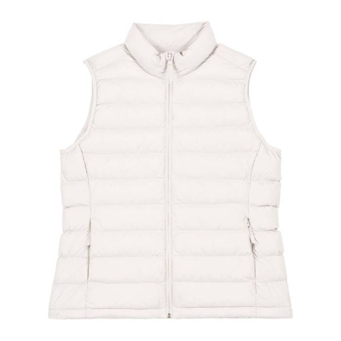 Ujjatlan kialakítás. Magas gallér. Fordított nejlon cipzár elöl, középen. Cipzáras zsebek díszszalaggal ellátott húzóval. Rugalmas szegőszalag a karkivágásnál. Teljesen steppelt kivitel. Oldalpanelek a jobb illeszkedésért. A belső varratok szegéllyel eldolgozva. Az alsó szegély állítható műanyag záróval és rugalmas zsinórral.