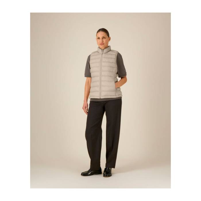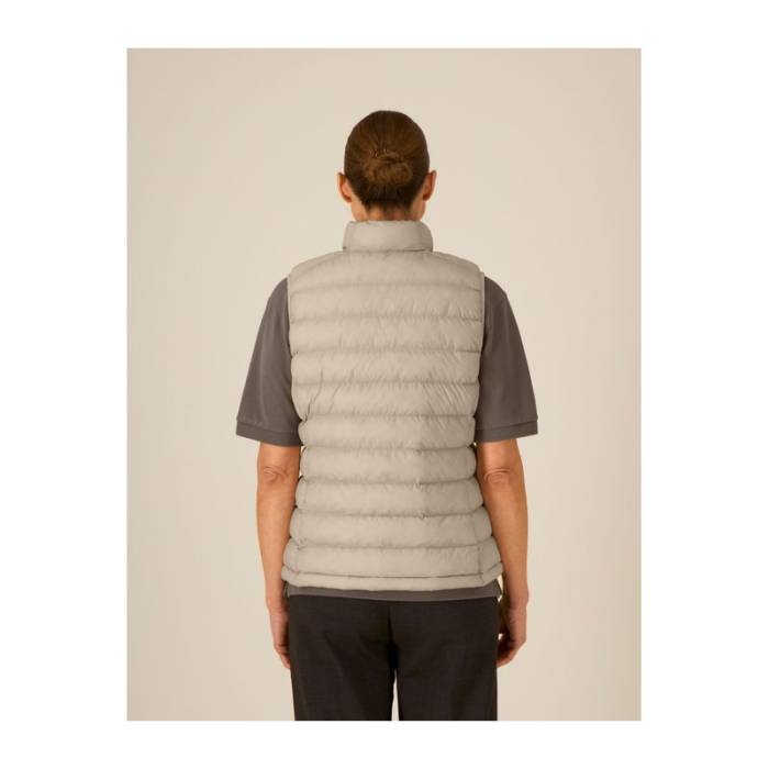 Ujjatlan kialakítás. Magas gallér. Fordított nejlon cipzár elöl, középen. Cipzáras zsebek díszszalaggal ellátott húzóval. Rugalmas szegőszalag a karkivágásnál. Teljesen steppelt kivitel. Oldalpanelek a jobb illeszkedésért. A belső varratok szegéllyel eldolgozva. Az alsó szegély állítható műanyag záróval és rugalmas zsinórral.