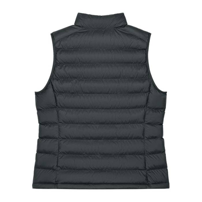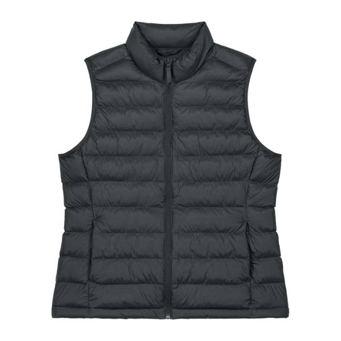 Ujjatlan kialakítás. Magas gallér. Fordított nejlon cipzár elöl, középen. Cipzáras zsebek díszszalaggal ellátott húzóval. Rugalmas szegőszalag a karkivágásnál. Teljesen steppelt kivitel. Oldalpanelek a jobb illeszkedésért. A belső varratok szegéllyel eldolgozva. Az alsó szegély állítható műanyag záróval és rugalmas zsinórral.