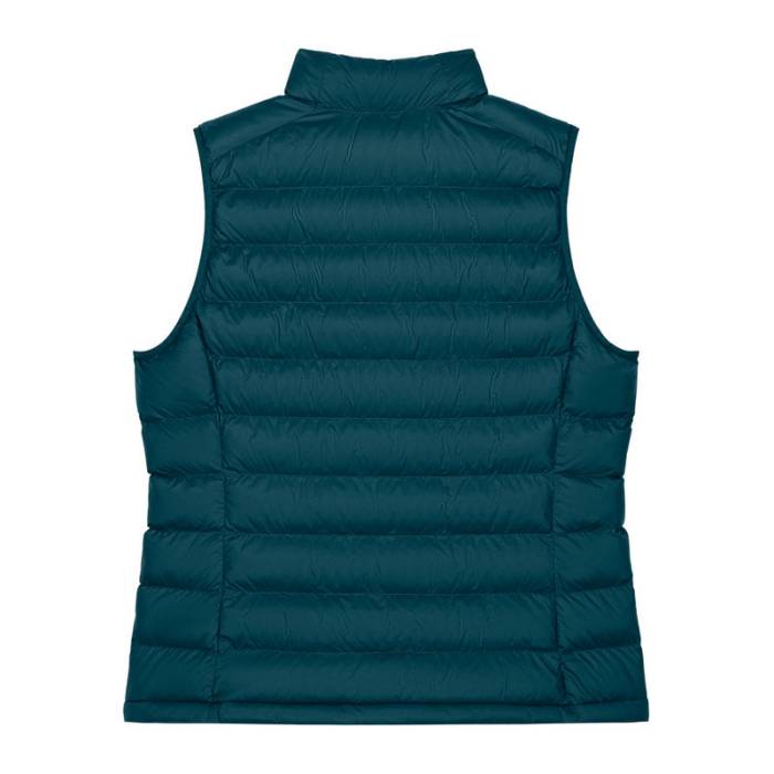 Ujjatlan kialakítás. Magas gallér. Fordított nejlon cipzár elöl, középen. Cipzáras zsebek díszszalaggal ellátott húzóval. Rugalmas szegőszalag a karkivágásnál. Teljesen steppelt kivitel. Oldalpanelek a jobb illeszkedésért. A belső varratok szegéllyel eldolgozva. Az alsó szegély állítható műanyag záróval és rugalmas zsinórral.