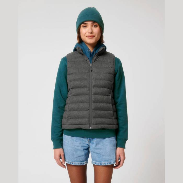 Kényelmes és divatos, ez az ujjatlan mellény magas gallérral, steppelt kialakítással és állítható szegéllyel rendelkezik. Cipzáras zsebek és oldalpanelekkel kiemelt, előnyös szabásvonal teszi különlegessé.