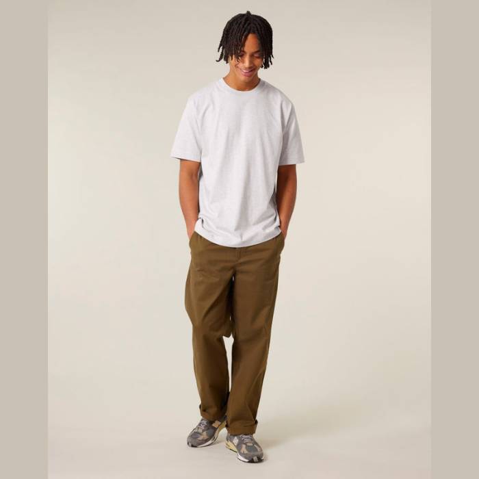 240g/m² súlyú póló, amely különleges, száraz tapintású anyagával tűnik ki. Klasszikus szabású ujjakkal, bordázott nyakrésszel és széles, dupla varrással készült. A természetes, nyers pamut, amelyet nem kezeltek és nem festettek, egyedi megjelenést biztosít.