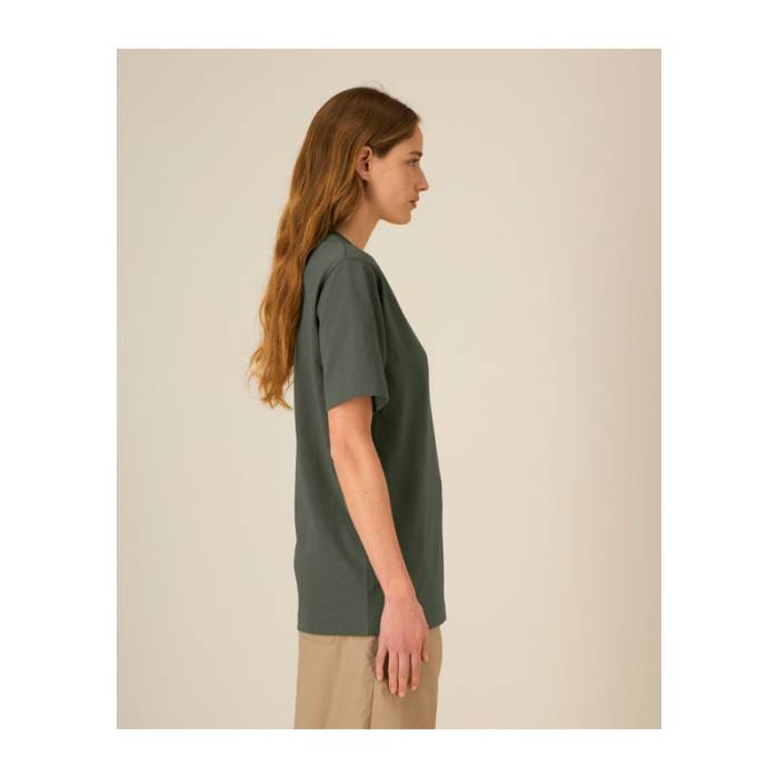 240g/m² súlyú póló, amely különleges, száraz tapintású anyagával tűnik ki. Klasszikus szabású ujjakkal, bordázott nyakrésszel és széles, dupla varrással készült. A természetes, nyers pamut, amelyet nem kezeltek és nem festettek, egyedi megjelenést biztosít.