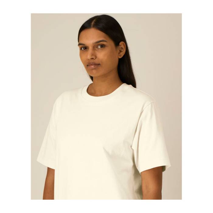 240g/m² súlyú póló, amely különleges, száraz tapintású anyagával tűnik ki. Klasszikus szabású ujjakkal, bordázott nyakrésszel és széles, dupla varrással készült. A természetes, nyers pamut, amelyet nem kezeltek és nem festettek, egyedi megjelenést biztosít.