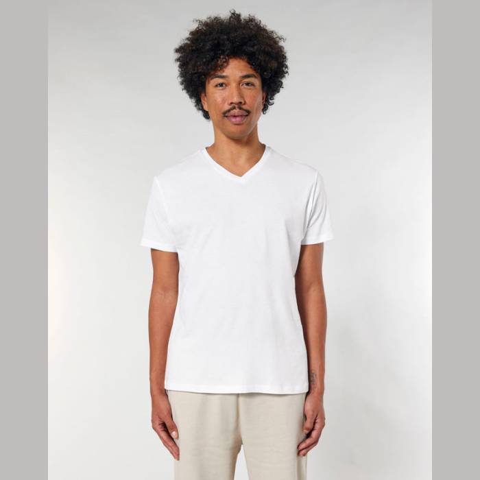 Elegáns férfi V-nyakú póló, amely bevarrt ujjakkal és azonos anyagból készült nyakpánttal rendelkezik. A szegélyeken található tartós, keskeny dupla tűzés gondoskodik a kifinomult megjelenésről. Ideális választás mindennapi viselethez.