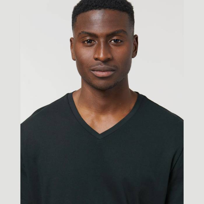 Elegáns férfi V-nyakú póló, amely bevarrt ujjakkal és azonos anyagból készült nyakpánttal rendelkezik. A szegélyeken található tartós, keskeny dupla tűzés gondoskodik a kifinomult megjelenésről. Ideális választás mindennapi viselethez.