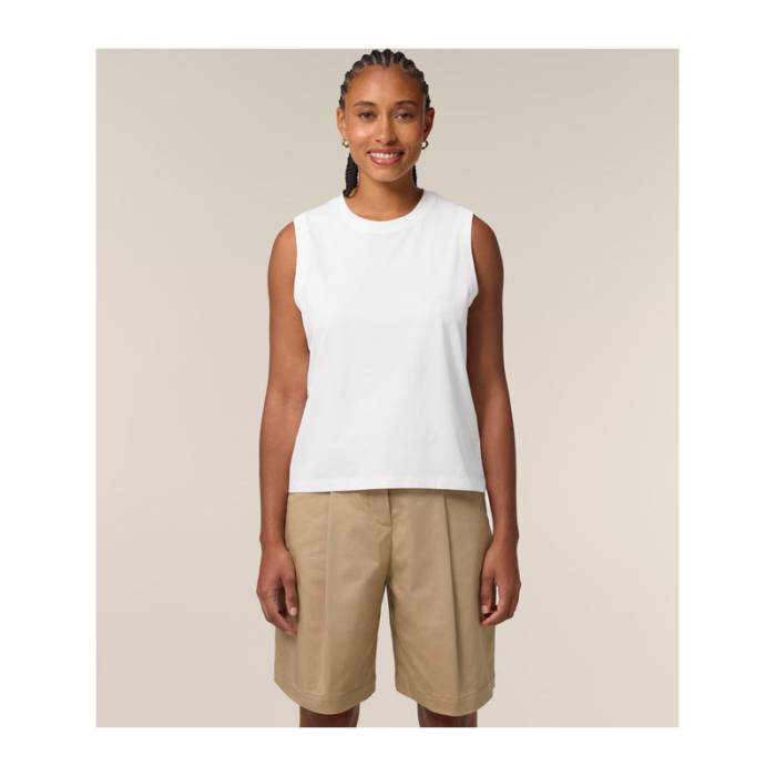 Elegáns, 155 g/m² súlyú közepes szabású ujjatlan felső, amely 100% organikus pamutból készült. Kényelmes viselet, bármilyen emblémázáshoz tökéletesen illeszkedik. Környezetbarát nyári öltözet.