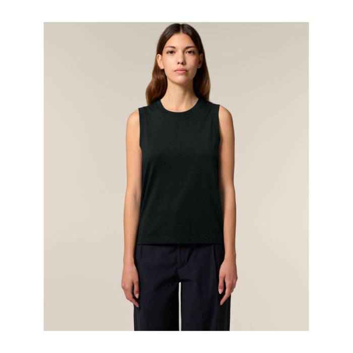 Elegáns, 155 g/m² súlyú közepes szabású ujjatlan felső, amely 100% organikus pamutból készült. Kényelmes viselet, bármilyen emblémázáshoz tökéletesen illeszkedik. Környezetbarát nyári öltözet.