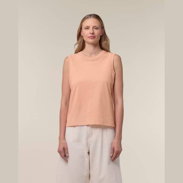 Elegáns, 155 g/m² súlyú közepes szabású ujjatlan felső, amely 100% organikus pamutból készült. Kényelmes viselet, bármilyen emblémázáshoz tökéletesen illeszkedik. Környezetbarát nyári öltözet.