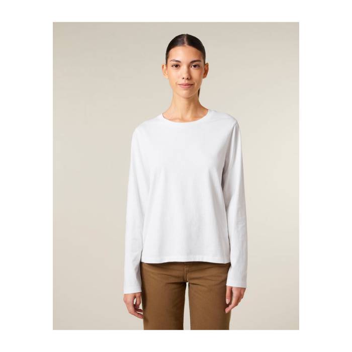 Női hosszú ujjú póló 100% organikus pamutból készült, kényelmes és kiváló emblémázási lehetőséget biztosít. Ideális választás hűvösebb időjárásra, minden korosztály és testalkat számára.