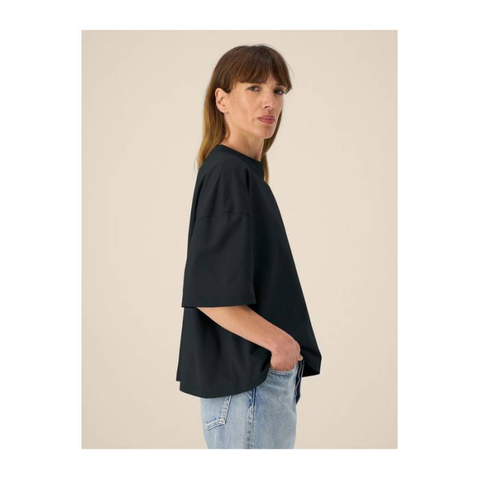 A The Hypster egy puha, újrahasznosított pamutkeverékből készült unisex póló. Modern „boxy” szabása prémium tapintást, sima felületet és laza megjelenést kölcsönöz. Életstílus-kollekciókhoz, zenei merchandise-hoz és kreatív brandinghez tervezték; egy öko-póló, amely ötvözi a kényelmet a kortárs stílussal. A bevarrt ujjak, az előrehelyezett vállvarrás és az 1x1-es bordás nyakkivágás letisztult sziluettet alkotnak, az ikertűs tűzés pedig garantálja a tartósságot. Tökéletes szitanyomáshoz vagy hímzéshez, ez a sokoldalú alapdarab egyesíti a fenntarthatóságot a modern vonzerővel.