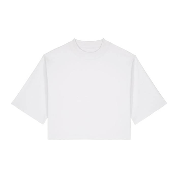 A The Stella Raya egy puha, újrahasznosított pamutkeverékből készült női cropped póló. Trendi „boxy” fazonja kényelmes érzetet és strukturált megjelenést biztosít. A bevarrt ujjak, a bordás nyakkivágás és az ikertűs tűzés felelnek a tartósságért és az alaktartásért. Könnyű és légáteresztő, ez a póló ideális választás trendi kollekciókhoz, lifestyle márkákhoz és zenei merchandise-hoz. Sima felülete kiváló alapot nyújt a látványos nyomatokhoz vagy hímzésekhez.