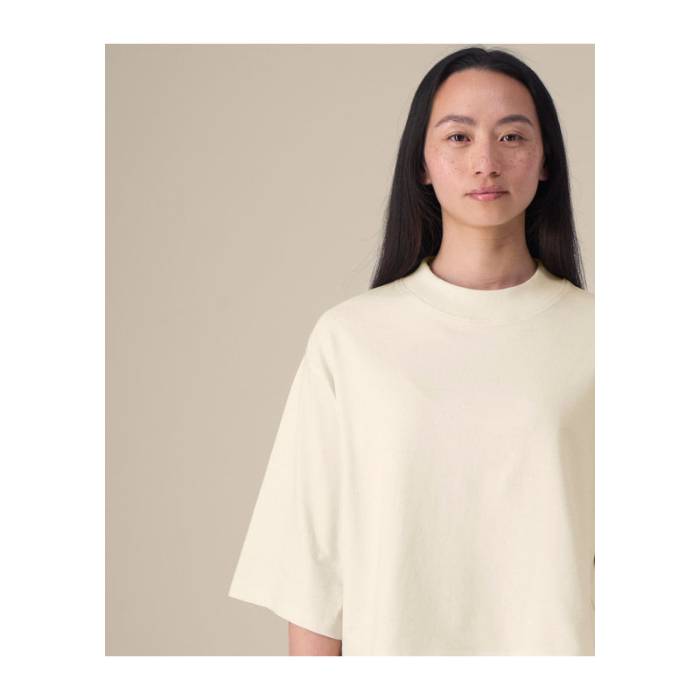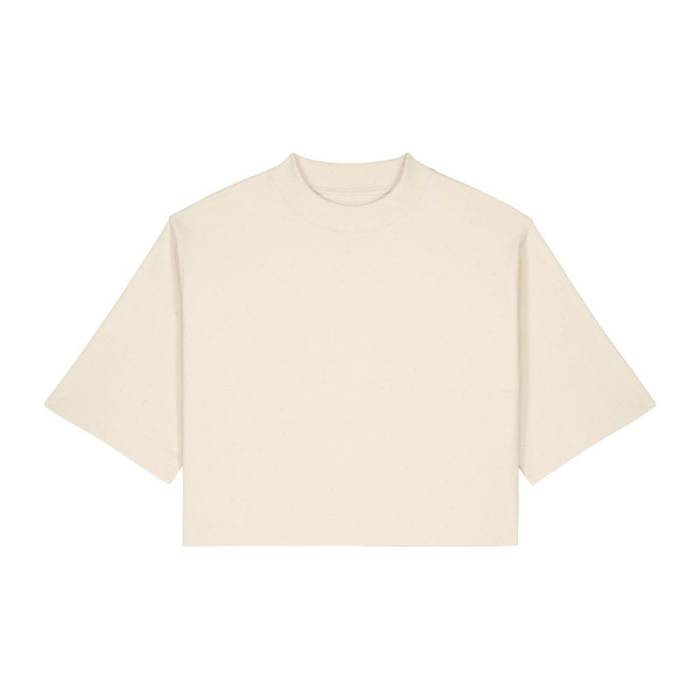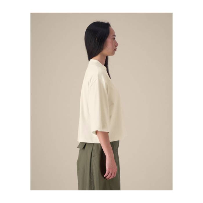 A The Stella Raya egy puha, újrahasznosított pamutkeverékből készült női cropped póló. Trendi „boxy” fazonja kényelmes érzetet és strukturált megjelenést biztosít. A bevarrt ujjak, a bordás nyakkivágás és az ikertűs tűzés felelnek a tartósságért és az alaktartásért. Könnyű és légáteresztő, ez a póló ideális választás trendi kollekciókhoz, lifestyle márkákhoz és zenei merchandise-hoz. Sima felülete kiváló alapot nyújt a látványos nyomatokhoz vagy hímzésekhez.