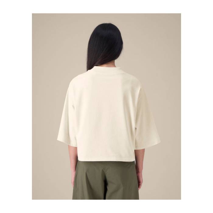 A The Stella Raya egy puha, újrahasznosított pamutkeverékből készült női cropped póló. Trendi „boxy” fazonja kényelmes érzetet és strukturált megjelenést biztosít. A bevarrt ujjak, a bordás nyakkivágás és az ikertűs tűzés felelnek a tartósságért és az alaktartásért. Könnyű és légáteresztő, ez a póló ideális választás trendi kollekciókhoz, lifestyle márkákhoz és zenei merchandise-hoz. Sima felülete kiváló alapot nyújt a látványos nyomatokhoz vagy hímzésekhez.