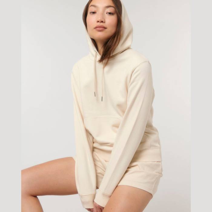 Elegáns uniszex kapucnis pulóver, amely dupla rétegű kapucnival, színben harmonizáló húzózsinórokkal és kenguruzsebbel rendelkezik. Tartós, ikertűs varrással készült, tiszta, kezeletlen természetes nyers pamutból.